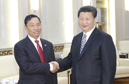 习近平在北京会见缅甸巩发党主席吴瑞曼 。 中新社