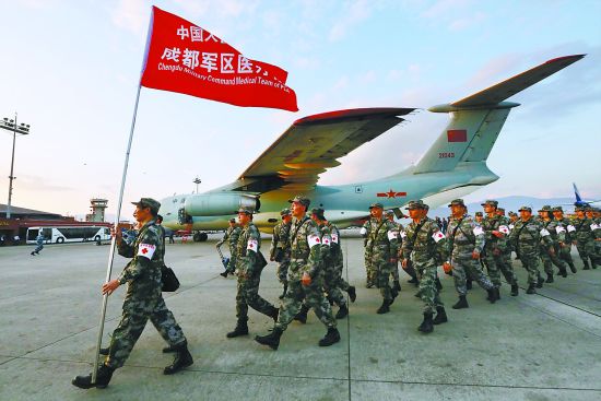 27日,中國空軍伊爾-76飛機飛抵加德滿都,機上搭載了37名醫護人員、20噸醫療設備和救災物資。