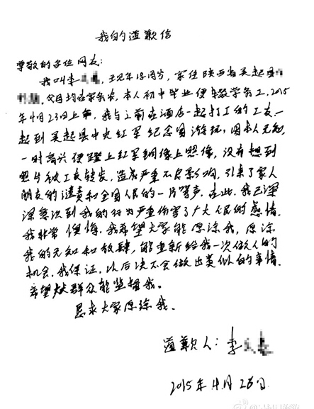 在道歉信中,李某称,4月23日上午,自己和工友到纪念园游玩时,因无知,一时高兴便蹬上红军铜像照相,没有想到照片被工友转发,造成严重不良影响。“在此,我已深深意识到我的行为严重伤害了广大人民的感情,我非常懊恼,希望大家能原谅我。”李某在道歉信中保证,以后绝不会做出类似的事情,并再次恳求大家原谅。