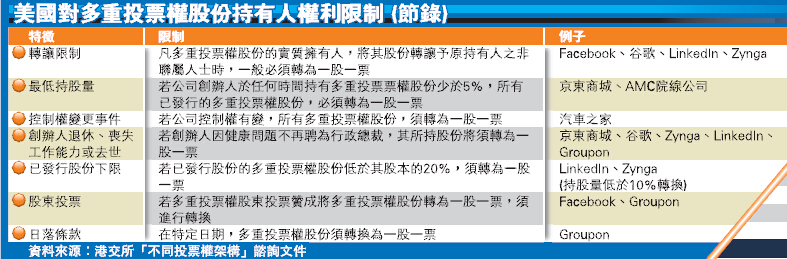【香港商報網訊】雖然美國證券市場容納以合夥人制度的上市公司,但該等以公司在上市時,亦設立條款,從而限制創始股東的投票權,從而避免他們的權力「無限擴張」,包括一旦公司創始股東因某些原因須「退下火線」,甚或持股量降低至若干水平,他們手上的多重投票權股份,須轉為一股一票,令其權力與一般公眾股東無異。