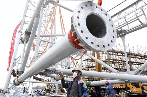 近日,淮南-南京-上海1000千伏特高壓輸變電工程泰州變電站進入電氣安裝階段,施工方在施工現場進行1000千伏出線構架吊裝等作業。泰州變電站動態投資19.86億元,2014年12月開工建設,預計2016年3月建成投運。工程投運后,江蘇過江通道輸電能力將由現在的900萬千瓦提高到1600萬千瓦。
