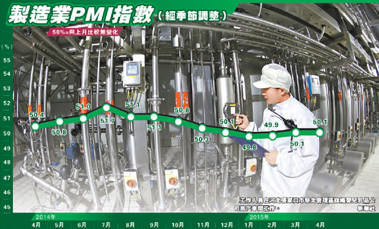 【香港商報网訊】國家統計局昨日公布,中國4月制造業PMI為50.1%,與上月持平。4月中國非制造業PMI為53.4%,環比下降0.3個百分點,表明中國非制造業繼續保持擴張狀態,但增速略有放緩。此前,路透調查的制造業PMI預估中值為50.0,上月為50.1。匯豐此前發布的中國4月制造業PMI初值創下12個月最低49.2。有分析認為,制造業PMI為50.1%表明,中國經濟增長呈現趨穩態勢,但制造業下行壓力依然存在。有金融機構分析人士稱,當月PMI延續「弱」擴張態勢,或許貨幣政策需進一步向寬松調整。