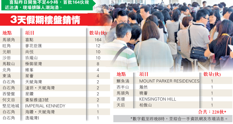 【香港商報網訊】記者劉家麗報道:五一長周末3天假期間,本港一手新盤成交暢旺,錄約228宗成交,創近8年來新高。上車盤及豪宅盤均有不俗成績,其中中國海外(688)與市建局合作發展的馬頭角「喜點」,昨日發售合共164伙,開售不足4小時即幾近沽清。