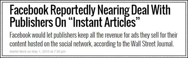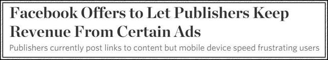 這段“緋聞”在美國東部時間2015年3月23日,由緋聞主角紐約時報正式披露。紐約時報當時的報道說,Facebook 向眾媒體機構提出直接在 Facebook 發布新聞而非內容鏈接的計劃(Facebook 在新聞內容上的布局可參考鈦媒體前文《Facebook 為布局新聞門戶下重注:廣告收入100%歸媒體,Facebook 不拿一分錢》),引起了業界的喧嘩。