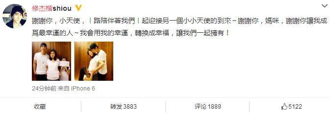 修杰楷公布贾静雯怀孕