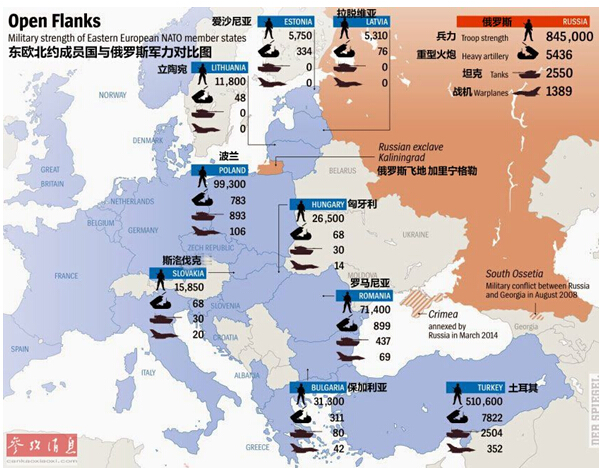 东欧北约成员国与俄罗斯的常规军力对比情况。