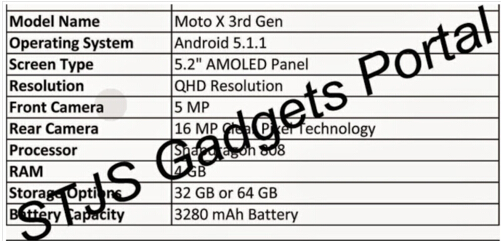 據悉,Moto X第三代將采用一塊5.2英寸的2K顯示屏,配置500萬像素前置+1600萬像素主攝像頭,內置4GB大運行內存(32GB或64GB機身存儲),處理器為驍龍808。另外,消息稱Moto X第三代將配備3280mAh容量電池,運行Android 5.1.1操作系統。