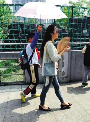 近日,网友爆料,一名女子让男孩为她打伞。照片中女子手里拿着扇子,男孩撑伞跟随其后。