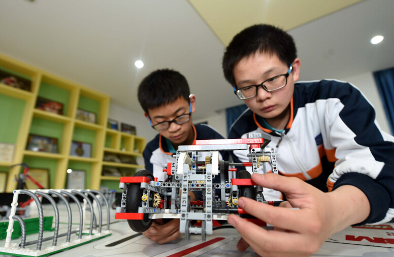 5月6日,在安徽省合肥市瑤海區第38中學的機器人活動室裏,史奔(右)和錢文琢在組裝調試機器人。