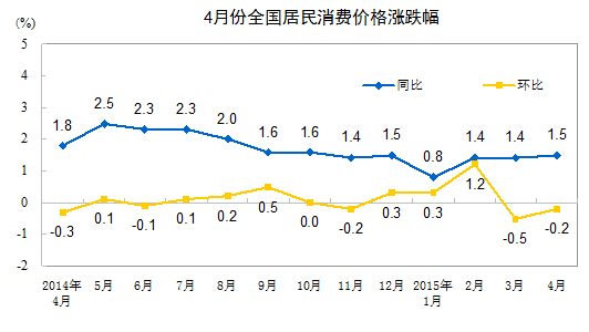 2015年4月份,全國居民消費價格總水平同比上漲1.5%。其中,城市上漲1.6%,農村上漲1.3%;食品價格上漲2.7%,非食品價格上漲0.9%;消費品價格上漲1.3%,服務價格上漲2.1%。1-4月平均,全國居民消費價格總水平比去年同期上漲1.3%。