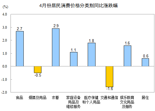 4月份,非食品價格同比上漲0.9%。其中,衣著、醫療保健和個人用品、娛樂教育文化用品及服務、家庭設備用品及維修服務、居住價格分別上漲2.9%、1.8%、1.6%、1.1%和0.6%;交通和通信、煙酒及用品價格分別下降1.6%和0.5%。