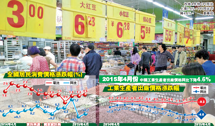 【香港商報網訊】昨日,國家統計局發布數據顯示:2015年4月份,內地居民消費價格總水平(CPI)同比漲1.5%,較上月回升0.1個百分點,創2015年來新高;工業生產者出廠價格(PPI)同比下降4.6%,環比下降0.3%。有金融機構專家預計,在外貿形勢嚴峻、低通脹的環境下,內地貨幣政策或進一步趨鬆;至於外界指「中國版QE」已經到來的揣測則未免誇大其詞,中國貨幣政策目前仍為中性適度。