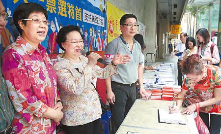 【香港商報網訊】記者李淇、王珈莉報道:「保普選·反暴力」大聯盟簽名行動昨日踏入第二日,獲不少港區人大代表極力相挺,爭取沉默大多數發聲,將港人希望落實普選的聲音傳遞至反對派耳中。基本法委員會委員譚惠珠昨早聯同港區人大代表蔡素玉、盧瑞安及顏寶玲身體力行,現身港鐵北角站外街站宣傳政改,收集市民簽名;下午由羅范椒芬、楊耀忠、張鐵夫等人接力,期間獲不少市民主動上前簽名支持。