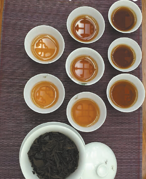 當天呈現給大家的1967年的文山包種老茶,頗為珍貴,葉條烏黑油亮,還略微帶著些新焙過火的煙火氣。初泡時,湯色棗紅,口感儼儼的,隨后越泡越煥發出清香氣韻,到十泡時,司茶手出湯時間延長到了5分鐘,茶水清甜潤口。茶主人說:「二十泡仍有餘香。」
