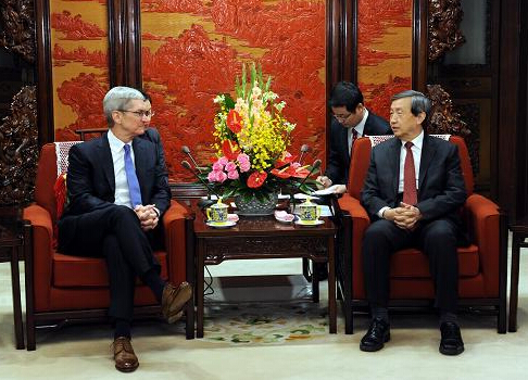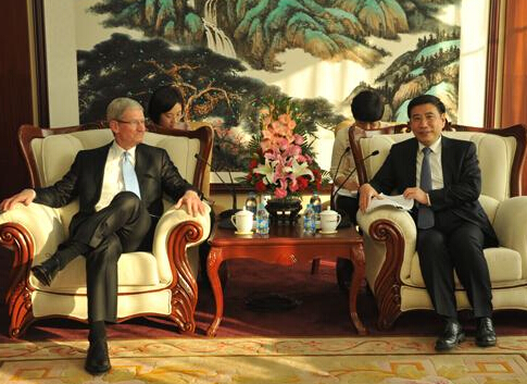 2012年3月,庫克以蘋果CEO的身份首次訪華,與時任國務院副總理的李克強、北京市市長的郭金龍見面。李克強表示,中國將加強知識產權保護。庫克表示將與中方深化全方位合作,依法誠信經營。
