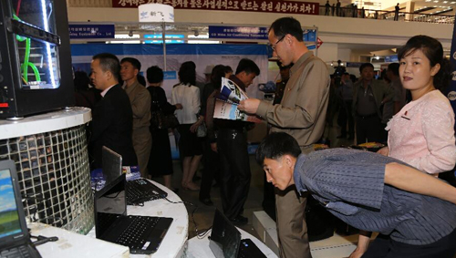 5月11日,在朝鲜首都平壤,人们在展览会上参观。当日,第18届平壤春季国际商品展览会在朝鲜平壤三大革命展览馆开幕。来自中国、俄罗斯、德国、新加坡、马来西亚等多个国家和地区的300多家公司参展,展品覆盖电子、机械、建材、食品等领域。新华社记者陆睿摄