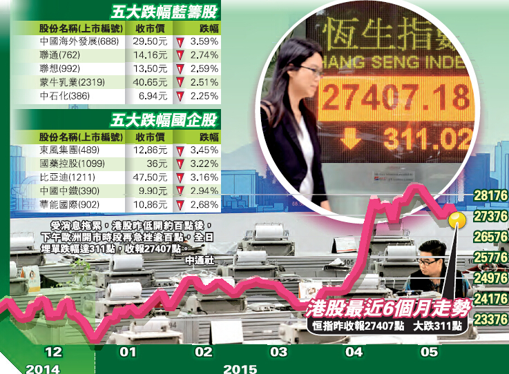 希臘債務問題告急,希臘與債權人談判仍未有實質進展,加上歐債遭大舉拋售,昨歐洲三大指數開市全線向下。希臘大約7.5億歐元國際貨幣基金組織(IMF)貸款到期,需用盡IMF特別提款權帳戶約6.5億歐元的儲備。受消息拖累,港股昨低開後約百點後,下午歐洲開市時段再急挫逾百點,全日埋單跌幅達311點,收報27407點。港匯昨續強報7.7521,反映本港未有資金流走,惟港股後市或繼續整固。