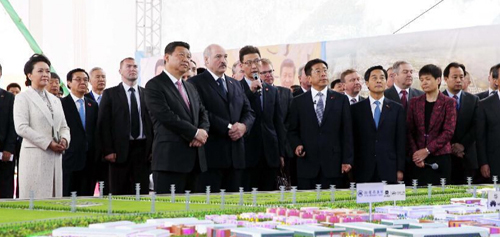 5月12日,国家主席习近平和夫人彭丽媛在白俄罗斯总统卢卡申科陪同下,在明斯克考察中国-白俄罗斯工业园。 新华社记者鞠鹏摄