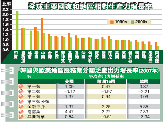 另外,再看看附表,表中比較了韓國與歐美地區服務業上的全要素生產力增長率(total factor productivity growth rate),報告顯示,2007年,韓國於以零售為主的第一類服務業的生產力雖高於歐洲15國,但仍稍低於美國,而第二類以酒店及餐飲業為主的服務業就更差於歐美兩地。雖然韓國在第三類的商業服務類表現較佳,但報告指出撇除金融及電信業後,其產出率實際上是大幅低於歐美大國,反映韓國國內資源運用上的生產力嚴重落後於全球已發展大國。以服務業的生產力計算,韓國似乎與「先進國」三字仍有一段距離,因為數據已指出,高階服務業中,過於集中金融發展已經窒礙了國內其他商業的興起,亦反映了韓國國內服務業生產力低企的癥結所在。