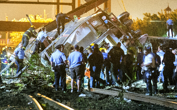 5月12日,在美国费城附近,救援人员在列车出轨事故地点搜寻伤者。