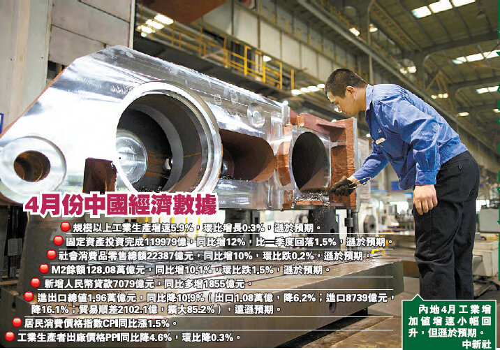 【香港商报网讯】昨日,國家統計局公布一系列經濟數據:4月份,內地規模以上工業增加值同比增長5.9%;社會消費品零售總額同比增長10%;1至4月固定資產投資同比增長12%,全部遜於市場預期。而人民銀行同日發布的金融統計數據報告亦顯示,4月末廣義貨幣供應量(M2)增速時隔3個月後再創歷史新低,人民幣新增貸款則跌至年內低點。有分析指,內地經濟下行壓力持續加大,顯示前期政策效果尚不顯著,政府需進一步推出托底政策,未來或再有降準減息。