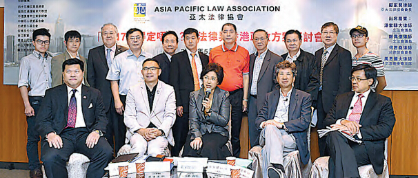 亞太法律協會昨日舉辦「2017,得定唔得?」法律界香港政改方案研討會,邀來不同背景的法律界人士講述政改,包括中澳法學交流基金會主席馬恩國、新界關注大聯盟發言人何君堯、獨立立法會議員謝偉俊,以及公民黨立法會議員湯家驊;亞太法律協會會長鄺家賢出任主持。
