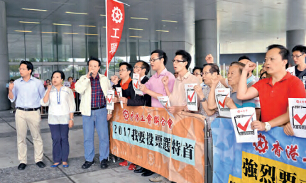 工聯會30多名代表手持「2017我要投票選特首」標語,高叫「反拉布、反暴力、保普選」、「一人一票選特首」等口號。王國興表示,一人一票選行政長官,是市民神聖的權利,由500萬合資格選民投票予自己心儀的候選人,總比只能在電視機前收看由1200人的提委會選出特首好。他說,若特首由一人一票選出,任何一位候選人都需聆聽選民的要求,不能回避市民的訴求;若政改原地踏步,特首則只須向1200名提委交代施政方針。