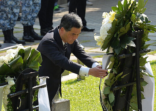去年9月3日,梁振英向出席在香港大会堂纪念花园举行的官方仪式,纪念中国人民抗日战争胜利。资料图