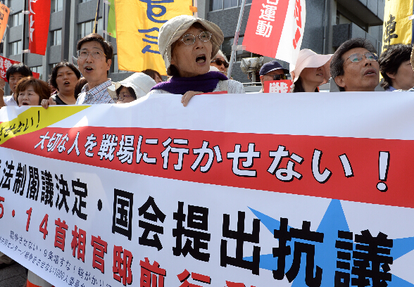 当日,日本安倍内阁将以阁议方式通过《安保关连法案》和《国际和平支持法案》。通过上述两个法案,将解禁行使集体自卫权的限制,扩大自卫队活动范围;同时可对处理国际纠纷的他国军队随时进行后方支持。对于安倍内阁的“通往战争之路”的修宪举动,日本部分民众在首相官邸前举行了抗议活动。