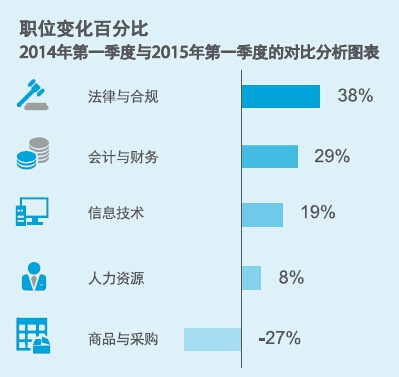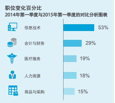在中國內地,得益于企業建立信息技術共享服務職能的趨勢和在線產品的增長,信息技術領域招聘投放廣告量漲幅最高,同比增長53%。電子商務公司擴展至金融服務行業,迅速帶動優秀信息技術人才的需求,互聯網金融成為另一個主要增長領域;共享服務中心的持續擴張也導致了對會計與財務專業人士需求的旺盛,招聘廣告投放量較2014年同期增長29%。