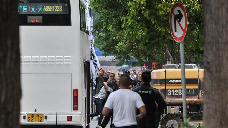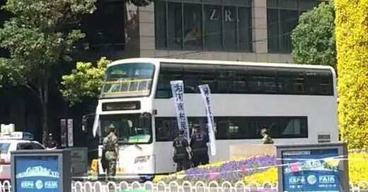 据现场图片显示,事发的公交车被大批警力团团围住,车窗内还伸出一些条幅,上书“为河南村民讨说法”。