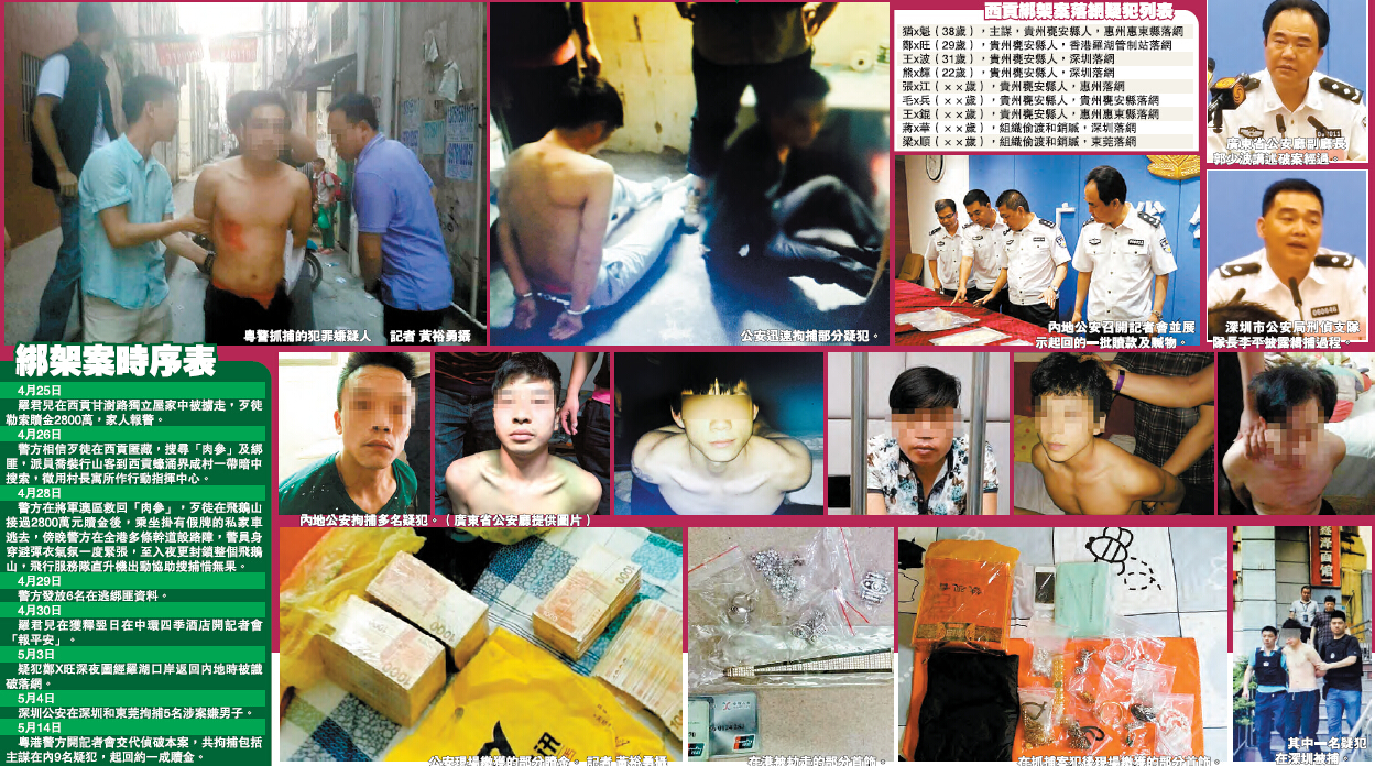【香港商報訊】記者黃裕勇報道:廣東省公安廳昨日通報偵破上月轟動全港的特大綁架案,部分涉案細節曝光。據省公安廳透露,除香港警方抓獲一名涉案疑犯外,省公安拘捕了8名內地涉案嫌疑人,並起獲被劫部分財物及280萬港元贖金,惟還有2500萬元贖金下落不明。省公安廳指案件是一宗有預謀的跨境劫財綁架案,來自貴州甕安縣的猶×魁被初步認定為主謀,更有部分落網劫匪在香港有犯罪前科,隨著案情進一步偵查,不排除有港人涉案。