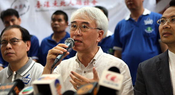“保普选、反暴力”大联盟发言人周融(中)昨在记者会上发言。新华社
