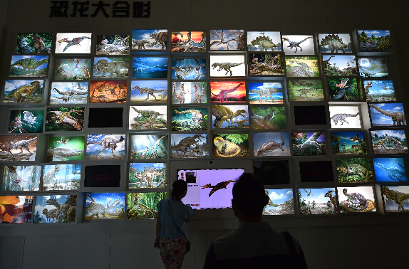 參觀者在數字化光電成像的“恐龍大全”前體驗互動。