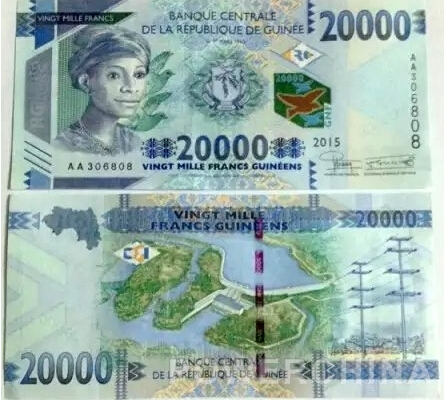 在几内亚2015新版货币中,最大面值的20000法郎纸币印上了“中国制造”的风景——中国电建承建的凯乐塔水电站工程。