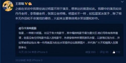 18日,王思聪在微博中转发了一条讽刺红毯女星的微博,并附上自己的观点:“如毯星某冰某予,除了根本无作品和不会演戏的硬伤,火起来主要靠绯闻水军话题和炒作。”