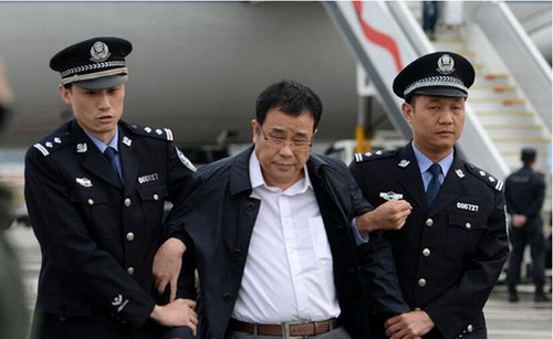 5月9日,在北京首都国际机场,李华波(中)被押解下飞机。当日,在中央反腐败协调小组的统一部署下,潜逃新加坡4年之久的江西省鄱阳县财政局经济建设股原股长李华波被遣返回国。这是“天网”行动开展以来职务犯罪国际追逃追赃专项行动取得的重要战果,也是公开曝光百名外逃人员后遣返的重要案犯。李华波,国际刑警组织红色通缉令号码A-1256/2-2011。新华社记者陈晔华摄