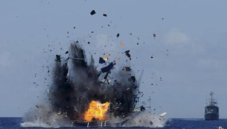 当地时间2015年5月20日,印尼北苏拉威西省,印尼海军炸沉在印尼海域非法捕鱼的19艘外国渔船。其中,有5艘越南渔船、2艘泰国渔船、11艘菲律宾渔船及1艘中国渔船。