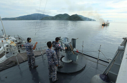 在印度尼西亚廖内省阿南巴斯群岛附近海域,印尼海军士兵向被扣押的越南渔船瞄准。(资料图)2014年12月5日,印度尼西亚海军在阿南巴斯群岛(Anambas)海域炸沉3艘闯入印度尼西亚海域非法捕鱼而遭扣押的越南渔船,随后又扣押22艘在巴布亚省南部海域非法捕鱼的中国大型渔船。展现印度尼西亚扞卫渔权的决心。