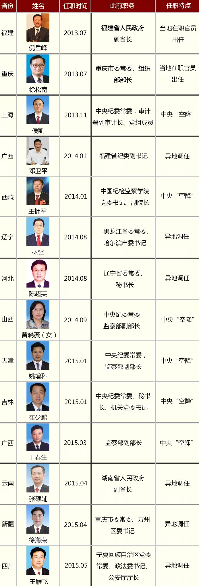 (原標題:十八大以來13省份換紀委書記 6人"空降"6人異地調入)