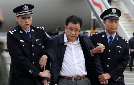 5月9日,在北京首都國際機場,李華波(中)被押解下飛機。李華波,國際刑警組織紅色通緝令號碼A-1256/2-2011。新華社記者 陳曄華 攝 圖片來源:新華網