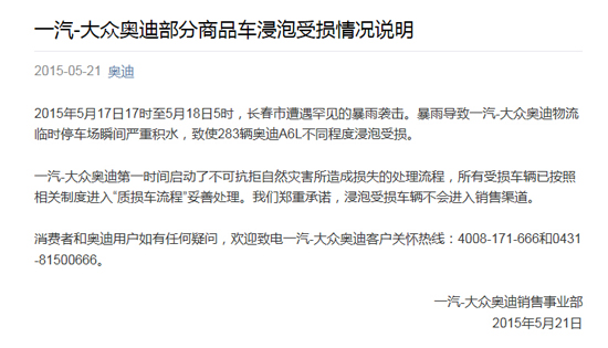 5月21日,一汽-大眾奧迪官方發布有關長春市物流停車場內車輛受到浸泡的說明。說明中一汽-大眾奧迪承認5月17日至5月18日,暴雨導致臨時停車場內遭遇嚴重積水,283輛奧迪A6L不同程度浸泡受損。但同時,一汽-大眾奧迪表示,所有受損車輛已按照相關制度進入“質損車流程”妥善處理,并鄭重承諾浸泡受損車輛不會進入銷售渠道。