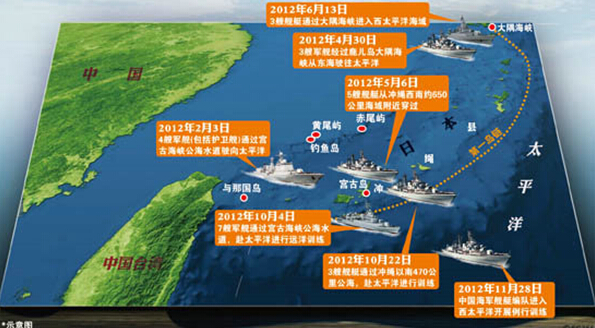 2009年3月开始,中国海军舰队穿越日本冲绳县的宫古海峡,进入西太平洋进行演练。日本媒体找到了炒作的由头,中国舰队每次经过这一国际水道,日本都要进行“全程拍摄”。