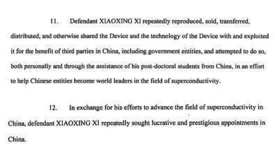 不過,美司法部起訴書的重點不是與超導技術相關設備,而是郗小星“多次復制、出售、轉讓、散布或以其他方式分享這臺設備及其技術”或“未遂”,由他本人直接進行或得到“他指導的、來自中國的博士后”研究人員協助,受益者則是“位于中國的第三方,包括一些政府實體”,目的是幫助這些中方實體在超導技術領先世界。
