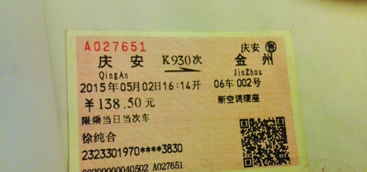第二天上午,徐純合一家人乘電動三輪摩托來到慶安火車站,徐純合買了兩張下午4點14分去大連金州的K 930次火車票。
