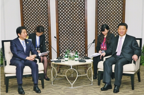 習近平指出,這兩年,中日關系出現嚴重困難的是非曲直是清楚的。雙方已就處理和改善中日關系發表四點原則共識,希望日方切實按照共識精神妥善處理好有關問題。習近平強調,歷史問題事關13億多中國人民感情,關系到本地區和平、穩定、發展大局,日本只有信守中日雙邊政治文件和“村山談話”等歷屆政府作出的承諾,才能同亞洲鄰國發展面向未來的友好關系。