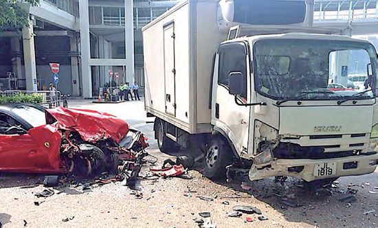 昨晨8時38分,肇事法拉利跑車駛經沙田馬場主看臺停車場對開服務路之際,姓何男司機(43歲)報稱為閃避不明動物而扭右浹,導致跑車失控越線,迎頭猛撞向另一輛運送凍肉的5噸半密斗貨車,結果兩車車頭嚴重毀爛,其中低重心的法拉利跑車,部分車頭更一度剷入貨車底部,以致車頭嚴重扭曲變形,毀爛如廢鐵,碎片及飛脫的零件散滿一地,至於被撞貨車則右前車軸折斷。