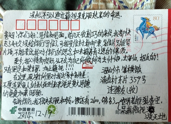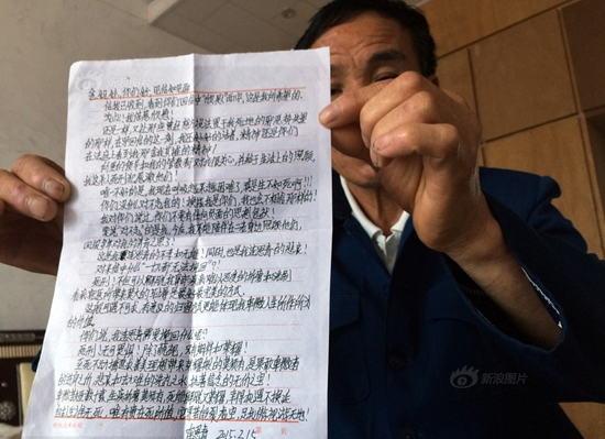2015年5月22日,浙江溫嶺市箬橫鎮浦岙村,連德友在展示兒子連恩青寄回家的信件。