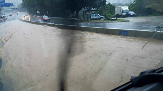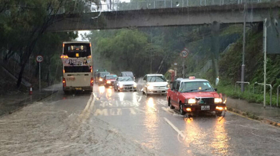 本港天氣持續惡劣,天文臺在短短45分鐘之內,先後發出黃色、紅色及今年首個黑色暴雨警告,至早上11時半改發黃色暴雨警告。今早的大雨為市區帶來超過70 毫米雨量,沙田、荃灣、西貢及馬鞍山更錄得超過100 毫米雨量。暴雨影響下,本港多處出現水浸,其中大埔道出現多個大水氹。