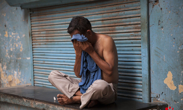 当地时间2015年5月24日,印度新德里,一名男子擦汗。 图片来源:Tsering Topgyal/东方IC